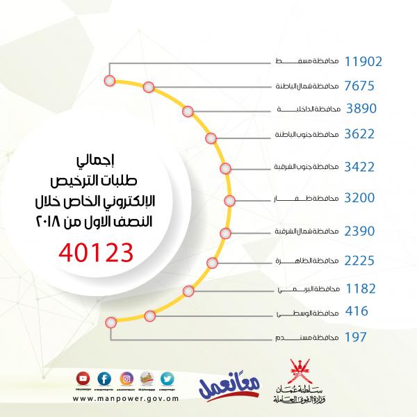 أظهرت إحصاءات وزارة القوى العاملة أن إجمالي التراخيص الإلكترونية الخاصة المصدقة إلكترونيا والمدفوعة بلغ 40123 ترخيصًا خاصاً، تم تسجيلها إلكترونيا بموقع الوزارة موزعة على جميع محافظات السلطنة خلال النصف الأول من العام 2018.