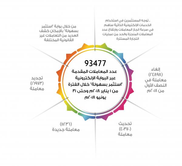 قالت وزارة التجارة والصناعة إنّ عدد المعاملات الإلكترونية التي تم تقديمها عبر البوابة الإلكترونية "استثمر بسهولة" خلال الفترة من مطلع يناير وحتى نهاية يونيو 2018؛ بلغ عددها 93477 معاملة إلكترونية. وتوجُّه المستثمرين في إجراء معاملاتهم عن طريق استخدام الخدمات الإلكترونية الذاتية المقدمة عبر البوابة ساهم في سرعة إنجاز المعاملات وارتفاع عدد المعاملات المنجزة، وتحقيق وضوح في الإجراءات، وإمكانية تحديث كافة بيانات الشركة إلكترونيا، وتوفير الوقت والجهد وزيادة الثقة لدى المستثمرين، وقد ساهمت البوابة في الحد من عمليات التجارة المستترة.
