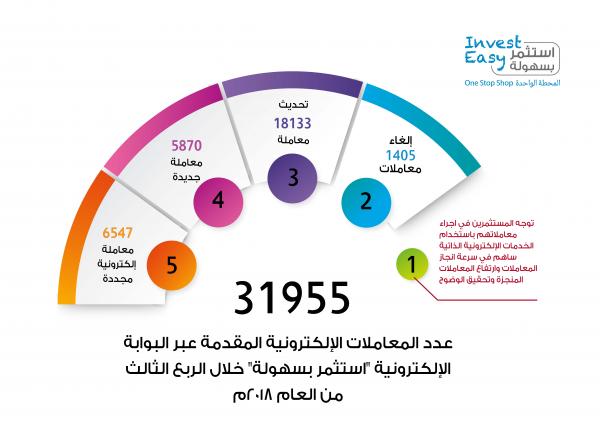 قالت وزارة التجارة والصناعة: إن عدد المعاملات الإلكترونية التي تم تقديمها عبر البوابة الإلكترونية "استثمر بسهولة" خلال الربع الثالث من العام الجاري بلغت 31955 معاملة إلكترونية، مشيرة إلى أن توجه المستثمرين في إجراء معاملاتهم عن طريق استخدام الخدمات الإلكترونية الذاتية المقدمة عبر البوابة ساهم في سرعة إنجاز المعاملات وارتفاع عدد المعاملات المنجزة وتحقيق وضوح في الإجراءات وإمكانية تحديث كافة بيانات الشركة إلكترونيا، وتوفير الوقت والجهد وزيادة الثقة لدى المستثمرين.