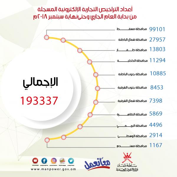 ويشهد نظام الترخيص التجاري الإلكتروني لاستقدام القوى العاملة غير العُمانية النجاح في سرعة إنجاز المعاملات والدقة والجودة في البيانات والشفافية في الإجراءات وتشير الإحصائيات إلى أنَّ أعداد التراخيص التجارية الإلكترونية المسجلة من بداية العام الجاري وحتى نهاية سبتمبر بلغت 193337 موزعة على مختلف المحافظات حيث بلغت محافظة مسقط 99101 ترخيص، ومحافظة شمال الباطنة 27957 ترخيصاً، ومحافظة جنوب الشرقية 8453 ترخيصا، ومحافظة الظاهرة 5869 ترخيصا، ومحافظة الداخلية 11294 ترخيصا، ومحافظة ظفار 13803 تراخيص، ومحافظة الوسطى 2914 ترخيصا، ومحافظة مسندم 1167 ترخيصا، محافظة جنوب الباطنة 10885 ترخيصا، ومحافظة شمال الشرقية 7398 ترخيصا، ومحافظة البريمي 4496 ترخيصا.