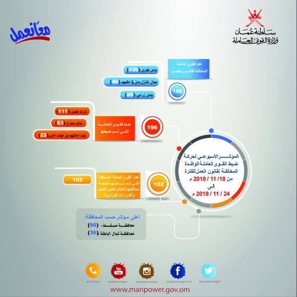 ومن جانب آخر سجل مؤشر وزارة القوى العاملة خلال الأسبوع الجاري ترحيل 102 عامل مخالف إلى خارج البلاد نتيجة مخالفتهم لأحكام قانون العمل والقرارات الوزارية المنفذة له.