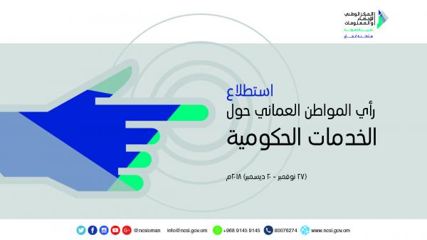 بدأ المركز الوطني للإحصاء والمعلومات استطلاع رأي العمانيين حول الخدمات الحكومية للتعرف على آراء المُواطنين العُمانيين حول عدد من المواضيع ذات الصلة بالخدمات التي تقدمها الحكومة للمواطن، كالصحة والتعليم والأمن وغيرها وكذلك التعرف على آراء المواطن من ناحية تقييمه لمستوى أداء عدد من المؤسسات الحكومية وذلك في إطار اهتمام متخذي القرار في السلطنة بالتعرف على الجوانب المختلفة من حياة المواطن العماني، سواء فيما يخص حياته اليومية أو رؤيته وتقييمه للخدمات التي يحصل عليها من الجهات والمؤسسات الحكومية المختلفة.