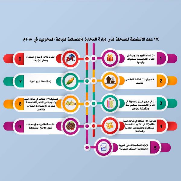 بلغ عدد أنشطة الباعة المتجولين التي تمّ تسجيلها في وزارة التجارة والصناعة خلال الفترة من بداية يناير وحتى نهاية ديسمبر من العام الماضي 214 نشاطا، مقارنة بـ 137 نشاطا تم تسجيلها خلال الفترة ذاتها من العام 2017.