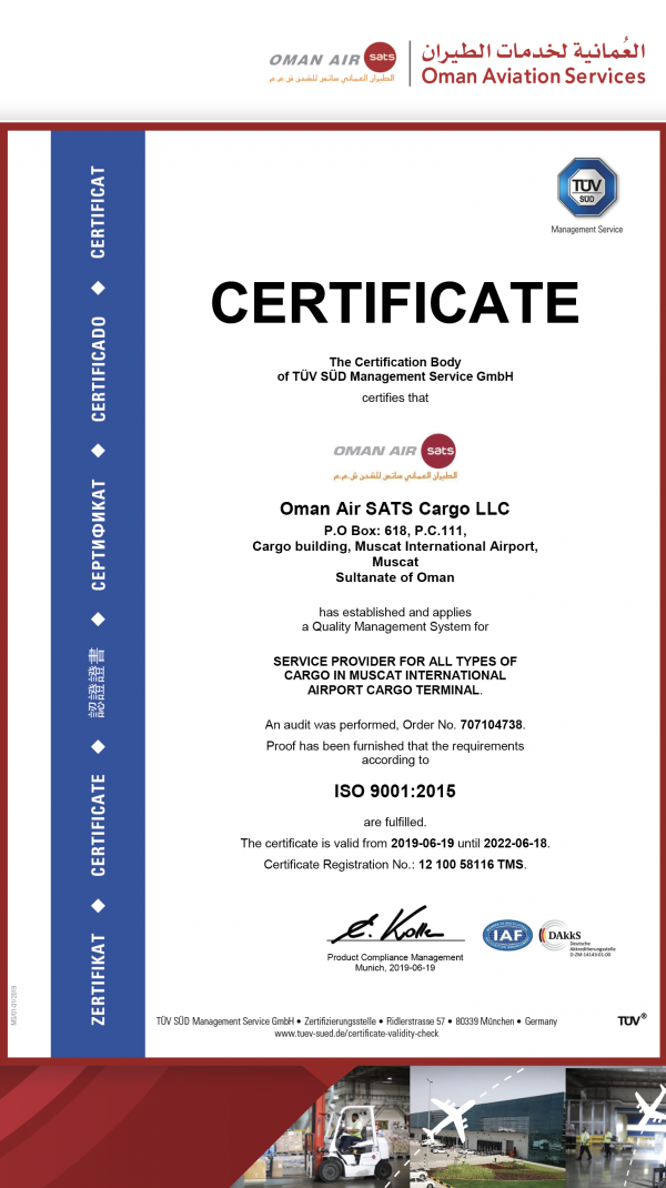 حصلت شركة الطيران العماني للشحن الجوي ساتس التابعة للشركة العمانية لخدمات الطيران على شهادة أيزو 2015:9001 في مجال نظام إدارة الجودة والتي تُمنح من قبل المنظمة العالمية للمقاييس والمواصفات(ISO) بعد استيفائها جميع الاشتراطات اللازمة واجتيازها اختبار الجودة بنجاح.