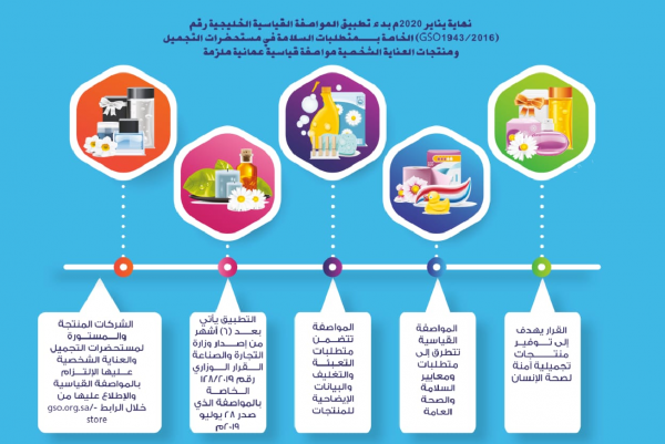 وأوضحتْ إخصائية ضبط جودة المنتجات الكيميائية أنَّ المُواصفة القياسية تطرقت لمُتطلبات ومعايير السلامة العامة؛ ومنها: أن تكون مستحضرات التجميل ومنتجات العناية الشخصية خالية من الخنزير ومشتقاته، وخالية من أي مواد غير نظيفة أو متحللة، وأن تكون متجانسة ومستقرة، ولا تتغيَّر خصائصها خلال مدة صلاحيتها عند تخزينها واستخدامها وفقا للتعليمات. وأضافت: تضمَّنت المواصفة مُتطلبات التعبئة والتغليف والبيانات الإيضاحية الواجب توافرها في جميع مستحضرات التجميل ومنتجات العناية الشخصية واشتملت على قائمة توضيحية بالمنتجات الخاضعة لهذه المواصفة.