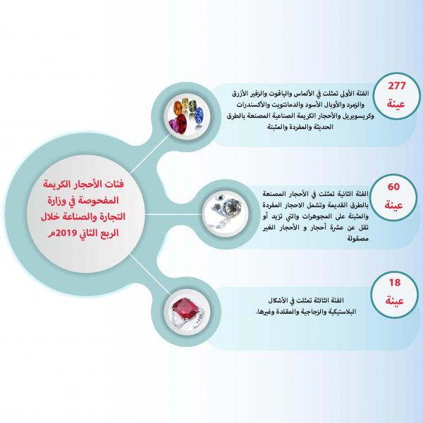 وأوضحت وزارة التجارة والصناعة أنّ عينات الفحص في الفئة الأولى ارتفعت بنسبة 13.5% في الربع الثاني من العام الحالي بتسجيل 277 عينة، مقارنة بـ 244 عينة تم فحصها خلال نفس الفترة من العام الماضي. وتتمثل الفئة الأولى من العينات في الألماس والياقوت والزفير الأزرق والزمرد والأوبال الأسود والدمانتويت والاكسندرايت وكريسوبريل عين القط، إضافة إلى الأحجار الكريمة الصناعية المصنعة بالطرق الحديثة والأحجار المفردة والمثبتة على المجوهرات والتي تزيد أو تقل عن عشر أحجار والأحجار غير المصقولة.