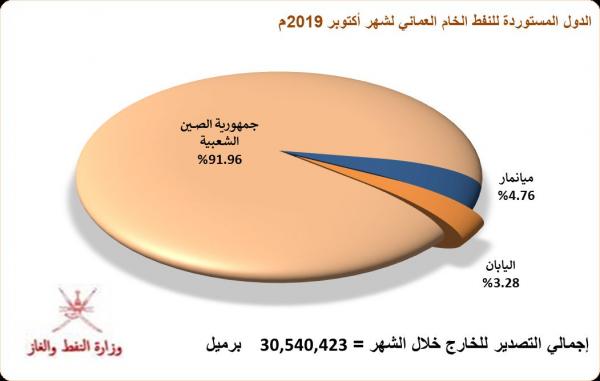 وشهدت واردات جمهورية الصين الشعبية من النفط الخام العماني ارتفاعًا ملحوظًا خلال أكتوبر بمقدار 14 بالمائة، لتسجل ما نسبته 96ر91 بالمائة من مجمل صادرات النفط الخام العماني مقارنة بشهر سبتمبر 2019م.