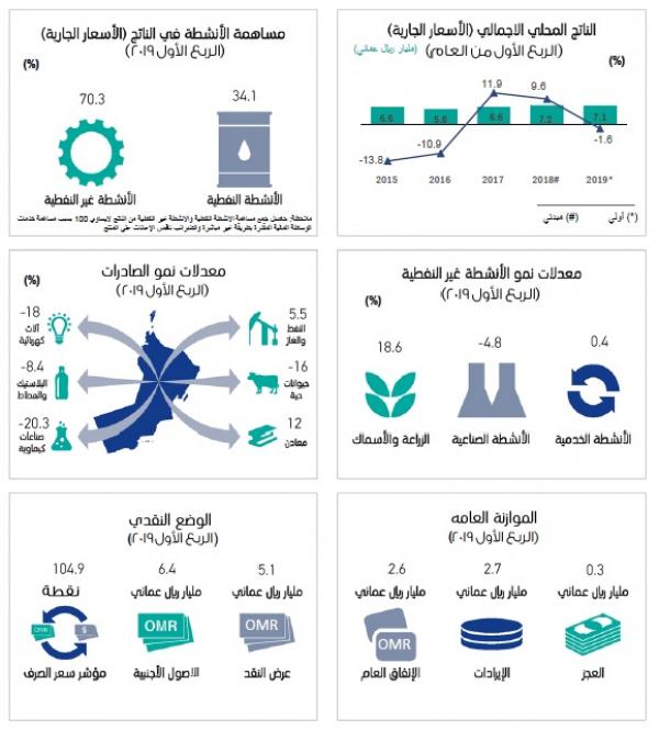 وانخفض إجمالي القيمة المضافة للأنشطة غير النفطية في الربع الأول من عام 2019 بنسبة 0.5% مسجلة 5 مليار ريال عماني. ويعزى ذلك الانخفاض إلى انخفاض القيمة المضافة للأنشطة الصناعية بـ 4.8% في حين ارتفعت القيمة المضافة لأنشطة الزراعة والأسماك بـ 18.6% كما ارتفعت القيمة المضافة للأنشطة الخدمية بـ 0.4%.
