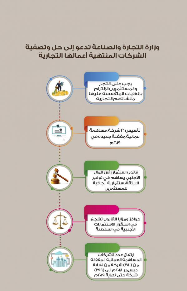 ونبهت وزارة التجارة والصناعة التجار والمستثمرين إلى ضرورة الالتزام بأغراض منشآتهم التجارية واستبعاد الأنشطة التجارية التي لم تتم مُمارستها على أرض الواقع من خلال اتخاذ إجراءات الإلغاء، وفقاً للإجراءات القانونية المعمول بها، وضرورة اتخاذ إجراءات الحل والتصفية بالنسبة للشركات التي انتهت من أعمالها التجارية وذلك وفقًا لقواعد القانون.