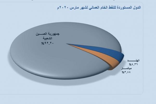 وبلغتْ كمِّيات التصدير اليومية للخارج من النفط الخام معدلاً وقدرة 738348 برميلاً، منخفضةً بنسبة 12.31%، مقارنة مع معدل التصدير اليومي للشهر الماضي. وتخطت واردات جمهورية الصين الشعبية حاجز الـ90% من مجمل صادرات النفط الخام العماني خلال شهر مارس 2020، مرتفعة بنسبة 2.47%؛ وذلك بالمقارنة مع حصة وارادتها خلال شهر فبراير 2020.