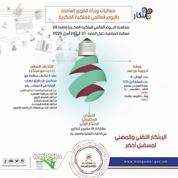 شاركت وزارة القوى العاملة الاحتفاء مع بقية الجهات في الاحتفال باليوم العالمي للملكية الفكرية، وذلك بعدد من الفعاليات الافتراضية لدعم الابتكار في المستقبل الأخضر.