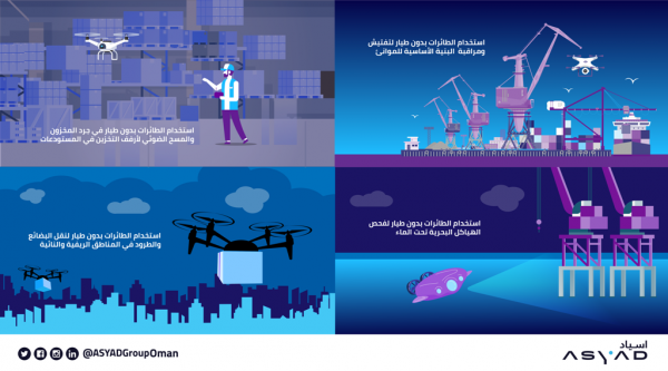 وتضمّن العرض- المنشور على الموقع الإلكتروني للمنتدى الاقتصادي العالمي- تجارب استخدام الطائرات بدون طيار (الدرونز) في السلطنة، في أربعة مجالات لوجيستية مختلفة وهي؛ تجربة الكشف عن البنية الفوقية للموانئ، وتجربة فحص الأعماق في الموانئ، وتجربة توصيل الطرود، وتجربة استخدام الدرونز في عمليات جرد المخازن.