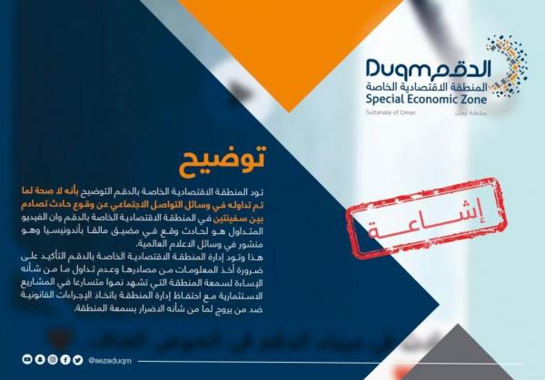 أكدت المنطقة الاقتصادية الخاصة بالدقم أنه لا صحة لما تم تداوله في وسائل التواصل الاجتماعي عن وقوع حادث تصادم بين سفينتين في المنطقة الاقتصادية الخاصة بالدقم.