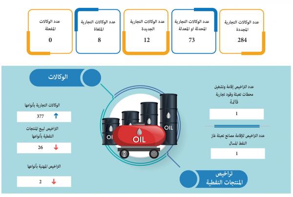 وأشارتْ دائرة الإحصاء بالوزارة إلى أنَّ هذه الوكالات تمثلت في 284 وكالة تجارية مجددة، و73 وكالة تجارية محدثة أو معدلة، و12 وكالة تجارية جديدة، و8 وكالات تجارية ملغاة، و26 ترخيصًا لبيع المنتجات النفطية بأنواعها، و2 ترخيص مهني.