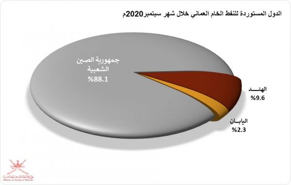 وشهدت واردات جمهورية الصين الشعبية من النفط العماني ارتفاعاً خلال شهر سبتمبر 2020 بمقدار 1.90%، لتسجل 88.1% من مجمل صادرات الخام العماني، وذلك بالمقارنة مع كميات شهر أغسطس 2020م. فيما ارتفعت واردات الهند بنسبة 7.4%، بينما انخفصت نسبة وارادات اليابان.