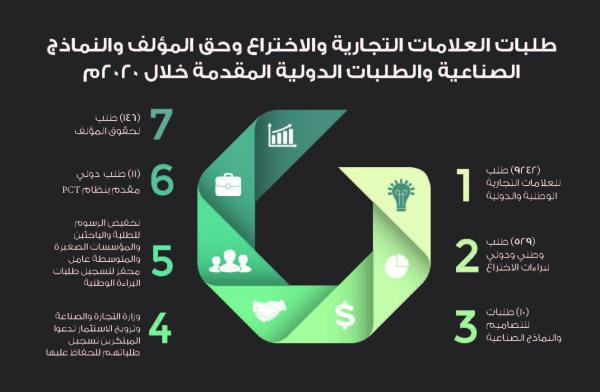 بلغ عدد طلبات العلامات التجارية "الوطنية" و"الدولية" وبراءات الاختراع وحق المؤلف والحقوق المجاورة والتصاميم والنماذج الصناعية والطلبات الدولية المقدمة لدى وزارة التجارة والصناعة وترويج الاستثمار خلال عام 2020م حوالي 9 آلاف و938 طلبًا.