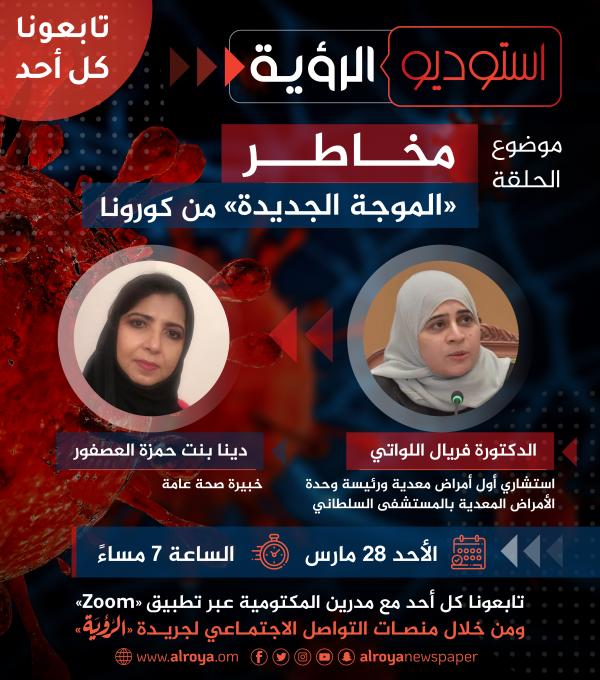 استعرضَ برنامج "استوديو الرؤية" مَخَاطر الموجة الجديدة من تفشي وباء كورونا في السلطنة والعالم؛ وذلك بمشاركة الدكتورة فريال اللواتية استشاري أول أمراض معدية ورئيسة وحدة الأمراض المعدية بالمستشفى السلطاني، والدكتورة دينا بنت حمزة العصفور خبيرة الصحة العامة.