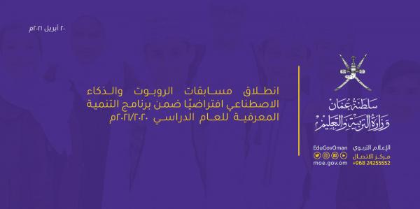 انطلقت صباح أمس الثلاثاء مسابقات الروبوت والذكاء الاصطناعي افتراضيًا ضمن برنامج التنمية المعرفية للعام الدراسي 2020/ 2021 بمشاركة 186 فريقا من مختلف المديريات التعليمية وتستمر لمدة 3 أيام.