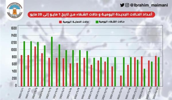 وقال المحلل الإحصائي إبراهيم بن أحمد الميمني إنه عند تحليل الإحصاءات منذ بداية شهر مايو وحتى يوم الخميس الماضي الموافق 20 مايو الجاري من الملاحظ انخفاض عدد الحالات الجديدة في أول 16 يومًا، فيما زادت الأعداد قليلًا بنفس مستوى بداية الشهر، مضيفًا أنه في الفترة نفسها شهدت الحالات الجديدة بعض الانخفاض فيما كانت حالات الشفاء أكثر من الحالات الجديدة الأمر الذي أدى إلى ارتفاع نسبة الشفاء من 89.5