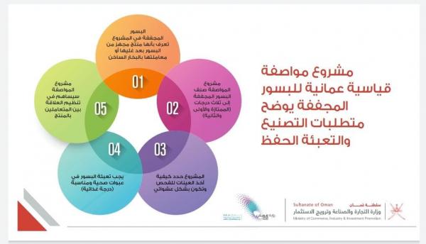 وأنجزت وزارة التجارة والصناعة وترويج الاستثمار، إعداد مشروع مواصفة قياسية عمانية للبسور المجففة المعدة للاستهلاك الآدمي المباشر المعبأة وغير المعبأة "النثر". ويهدف المشروع إلى التعريف باشتراطات تصنيع وتعبئة البسور وطرق حفظها ونقلها بالإضافة إلى عدد من المتطلبات الأخرى، كما إن مشروع المواصفة لا يختص بالبسور المجففة المستخدمة كعلف للحيوانات.