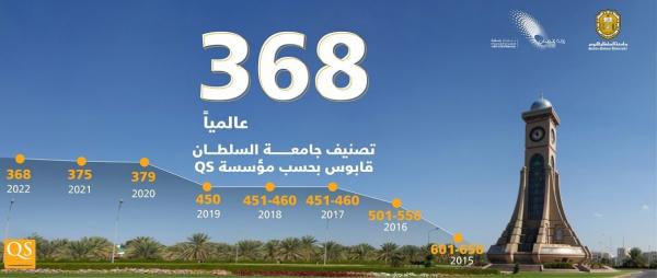 حققت جامعة السلطان قابوس تحسنا مستمرا في ترتيبها خلال السنوات الست الماضية على التوالي، ضمن التصنيف العالمي للجامعات كيو إس QS؛ إذ حققت الترتيب رقم 368 لعام 2022 متقدمةً على ترتيبها السابق والذي كان 375 لعام 2021.