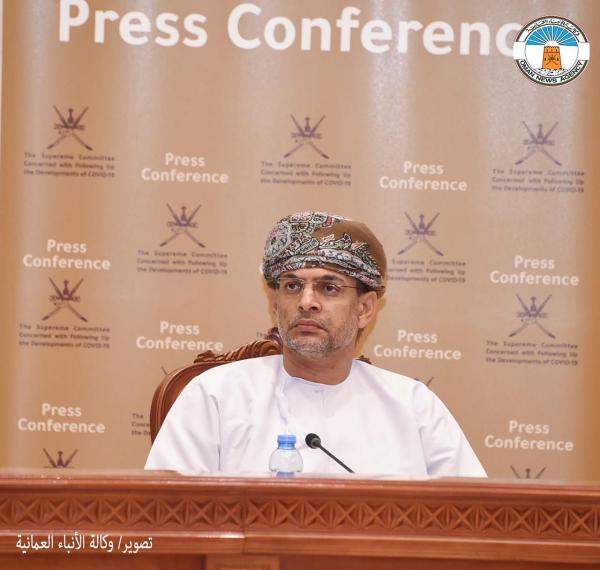 جاء ذلك خلال المؤتمر الصحفي للجنة العليا المكلفة ببحث آلية التعامل مع التطورات الناتجة عن انتشار فيروس كورونا، بحضور معالي الدكتور أحمد بن محمد السعيدي وزير الصحة، عضو اللجنة العليا، وسعادة سالم بن محمد النعيمي وكيل وزارة النقل والاتصالات وتقنية المعلومات للنقل، المكلف بأعمال هيئة الطيران المدني، والعميد محمد بن ناصر الكندي مدير عام العمليات بشرطة عمان السلطانية، ومبارك بن محمد الدوحاني مدير عام التجارة بوزارة التجارة والصناعة وترويج الاستثمار، والدكتور سيف بن سالم العبري مدير عام مراقبة ومكافحة الأمراض بوزارة الصحة، والدكتورة ثمرة بنت سعيد الغافرية المكلفة بأعمال المدير العام للخدمات الصحية لمحافظة مسقط، وبدر بن سيف الرواحي مدير مكافحة الأمراض المعدية بوزارة الصحة.
