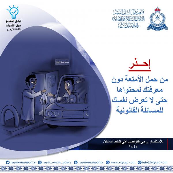 وتدعو شرطة عمان السلطانية ممثلة في الإدارة العامة لمكافحة المخدرات والمؤثرات العقلية جميع المواطنين والمقيمين إلى التعاون لمكافحة هذه السموم، وإبلاغ رجال الشرطة عن أي معلومات تساعد في الكشف عن تجار ومهربي تلك السموم، وذلك بالتواصل مع الإدارة العامة لمكافحة المخدرات والمؤثرات العقلية على الخط الساخن (١٤٤٤) أو (9999) أو التوجه إلى أقرب مركز شرطة.