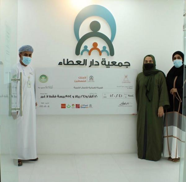سلَّمت جمعية دار العطاء شيكا بـ120,241 ريالا عمانيا للهيئة العمانية الأعمال الخيرية، ضمن حملة "لأجلك فلسطين" التي دشنتها الدار.. وتسلَّم الشيك من جانب الهيئة الرئيس التنفيذي محمد بن حمود الذهلي، فيما سلَّمه من جانب "دار العطاء" المكرمة مريم بنت عيسى الزدجالي رئيس مجلس الإدارة.