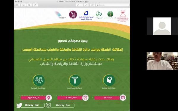 انطلقتْ أطلقتْ إدارة الثقافة والرياضة والشباب بمحافظة البريمي الأنشطة الثقافية والرياضية والشبابية لهذا العام، عبر تقنية الاتصال المرئي، وذلك بالتعاون مع اللجنة الشبابية بنادي النهضة، ومنتديات محافظة البريمي، وصالون فاطمة العلياني الأدبي، والجمعية العُمانية للكتاب والأدباء.. وذلك تحت رعاية سعادة خالد بن سالم السيل الغساني مستشار وزارة الثقافة والرياضة والشباب.