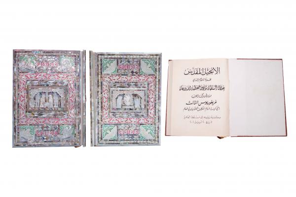 يعرض المتحف الوطني الطبعة الثانية من (الإنجيل المقدس) الذي تعود طباعته لـ 29 فبراير 1960م ببلدة (حِرِيصَا) اللبنانية، المُهداة إلى السلطان قابوس بن سعيد (طيب الله ثراه)، والمصنوعة من أم اللآلئ، والورق المعدني الملون، والورق المقوى، والمطبوعة باللونين الأسود والأحمر.