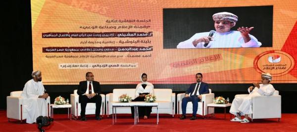ومن ثم، انطلقت الجلسة النقاشية الثانية بعنوان "رقمنة الإعلام وصناعة الوعي"، وشارك فيها كل من: الدكتور محمد بن عوض المشيخي الأكاديمي والباحث في الرأي العام والاتصال الجماهيري، وبثينة البلوشية الإعلامية ومذيعة الأخبار، ومحمد عبدالرحمن المحلل الإعلامي ومؤسس "إعلام دوت كوم" بجمهورية مصر العربية، وأحمد عصمت مدير منتدى الإسكندرية للإعلام ومحاضر أكاديمي من جمهورية مصر العربية، فيما يدير الجلسة قصي الزدجالي من إذاعة "هلا.إف.إم".