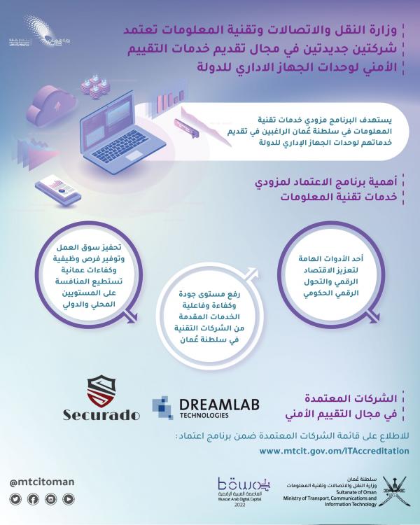 اعتمدت وزارة النقل والاتصالات وتقنية المعلومات شركتين إضافيتين ضمن "برنامج الاعتماد الخاص بمزودي خدمات تقنية المعلومات" والذي يستهدف مزودي خدمات تقنية المعلومات في سلطنة عُمان الراغبين في تقديم خدماتهم لوحدات الجهاز الإداري للدولة، حيث تم اعتماد شركة "العنقاء لحلول التكنولوجيا" وشركة "مختبر الأحلام للتكنولوجيا" في مجال التقييم الأمني.