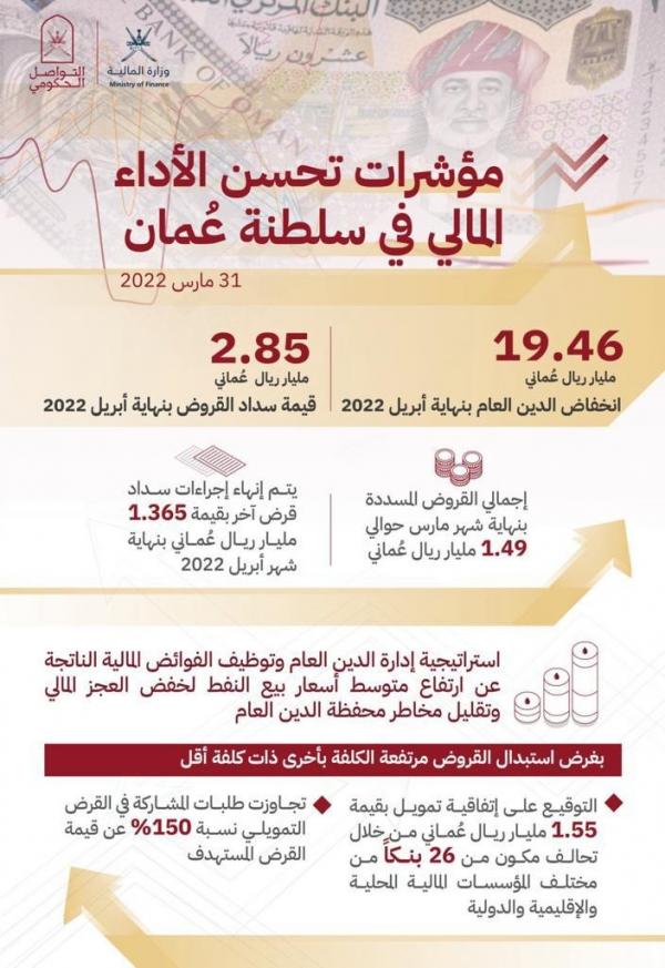 وأوضحت الوزارة أنها تسعى لتوظيف الفوائض المالية الناتجة عن ارتفاع متوسط أسعار بيع النفط لخفض العجز المالي وتقليل كلفة ومخاطر محفظة الدين العام؛ حيث اعتمدت في الميزانية العامة للدولة لعام 2022م نحو 3ر1 مليار ريال عماني لسداد فوائد القروض والالتزام بسداد الأقساط المستحقة لهذا العام بنحو 7ر2 مليار ريال عماني.