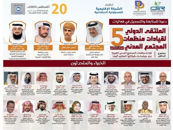 نظمت الشبكة الإقليمية للمسؤولية الاجتماعية الملتقى الدولى الخامس لقيادات المجتمع المدني لعام 2022، بعنوان "قيادة منظمات المجتمع المدني العربية نحو حوكمة بناء شراكاتها لتعظيم أثرها"، بمشاركة دولية واسعة من الخبراء والمتخصصين بهدف مناقشة الإطار المفاهيمي والمبادئ الأساسية لحوكمة بناء الشراكات بمنظمات المجتمع المدني، والأطر القانونية والتشريعية لحوكمة شراكات منظمات المجتمع المدني ومناقشة الأهداف المرجو تحقيقها من حوكمة هذه الشركات.
