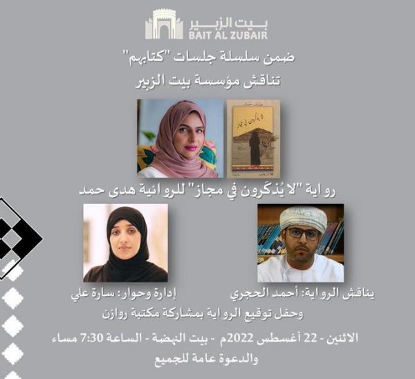 تعقد مُؤسسة بيت الزبير مساء اليوم جلسة حول الإصدار الجديد "لا يذكرون في مجاز"، للروائية العمانية هدى حمد، وذلك ضمن سلسلة فعاليات "كتابهم".