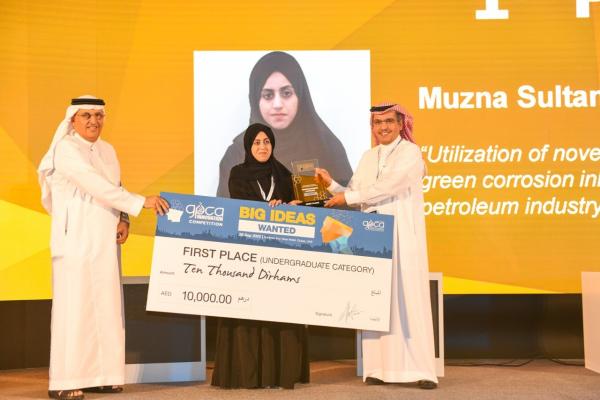 وفازت بالمركز الأول في فئة البكالوريوس، مزنة بنت سلطان الجابرية من جامعة صحار، عن مشروعها الذي يتضمن استخدامها مادة صديقة للبيئة مضادة للتآكل البحري، مركبة من الكتلة الحيوية البحرية لحماية خطوط الأنابيب البترولية.
