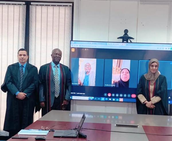 وتكونت لجنة المناقشة من الدكتور السيد الصاوي رئيسا، والدكتور عثمان عثمان مشرفا، والدكتورة شيخة المسلمي ممتحنا داخليا، والأستاذ الدكتور موسى آدم ممتحنا خارجيا.