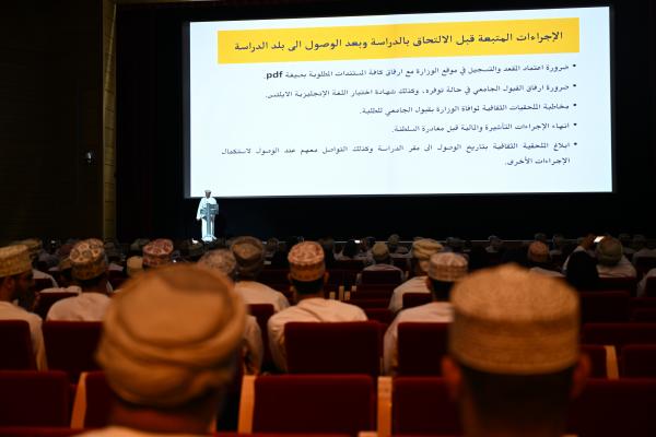 نظمت وزارة التعليم العالي والبحث العلمي والابتكار لقاءً تعريفيًا للطلبة الجدد المقبولين في المنح والبعثات الخارجية للعام الجامعي 2023/2024، وذلك في القاعة الكبرى بمركز السلطان قابوس الثقافي بجامعة السلطان قابوس، إذ يأتي هذا اللقاء بهدف تزويد الطلبة المبتعثين وأولياء أمورهم بأبرز مستجدات وإجراءات الابتعاث في الجوانب الأكاديمية والقانونية والمالية والدينية.