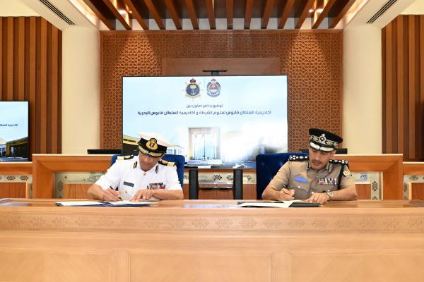 وقّعت أكاديمية السلطان قابوس لعلوم الشرطة وأكاديمية السلطان قابوس البحرية، الثلاثاء، برنامج تعاون مشترك يهدف إلى تطوير السياسات والنظم الأكاديمية وضمان الجودة ودعم البحث العلمي وتعزيز التعاون في المجالات الأكاديمية والبحثية وتبادل الخبرات والاستشارات والإصدارات والمواد التعليمية.