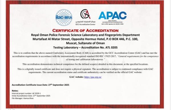 ويمثل هذا الاعتماد تتويجًا للجهود المبذولة من شرطة عمان السلطانية لتحديث البنية الفنية للمختبر، من خلال اقتناء أحدث التقنيات والأنظمة الرقمية، وتعزيز كفاءة العاملين عبر برامج تدريبية متخصصة؛ بما يسهم في الارتقاء بمستوى الأداء وتحقيق العدالة الجنائية وفق أرقى المعايير العالمية.