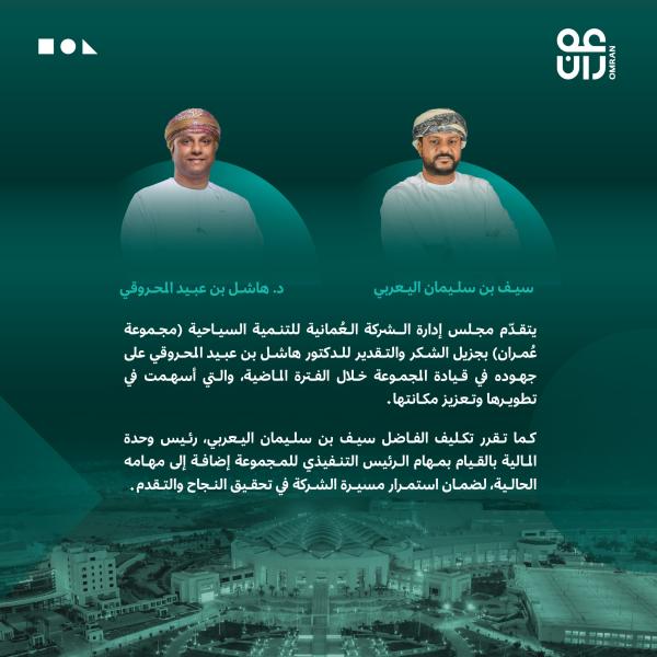 وقالت الشركة في منشور عبر حسابها الرسمي على منصة "إكس": "تتقدّم مجموعة عُمران بجزيل الشكر والتقدير للدكتور هاشل بن عبيد المحروقي على إسهاماته القيّمة، وتُعلن تكليف الفاضل سيف بن سليمان اليعربي بمهام الرئيس التنفيذي للمجموعة إلى جانب مهامه الحالية".