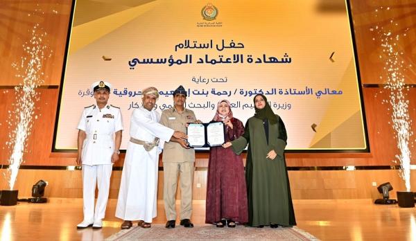 وسلمت معالي الدكتورة رحمة بنت إبراهيم المحروقية وزيرة التعليم العالي والبحث العلمي والابتكار ورئيسة مجلس إدارة الهيئة العُمانية للاعتماد الأكاديمي شهادة الاعتماد للعميد الركن جوي (مهندس) محمد بن عزيز السيابي عميد الكلية العسكرية التقنية، بحضور معالي الدكتور محمد بن ناصر الزعابي أمين عام وزارة الدفاع رئيس مجلس الأمناء، واللواء الركن بحري سيف بن ناصر الرحبي قائد البحرية السُّلطانية العُمانية رئيس مجلس إدارة الكلية العسكرية التقنية. حضر المناسبة عدد من المسؤولين.