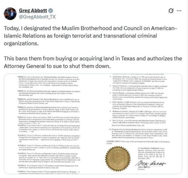 أعلن حاكم ولاية تكساس الأمريكية، الجمهوري غريغ أبوت، تصنيف كلٍّ من جماعة الإخوان المسلمين ومجلس العلاقات الأمريكية الإسلامية (كير) كـ"منظمات إرهابية أجنبية" و"منظمات إجرامية عابرة للحدود".