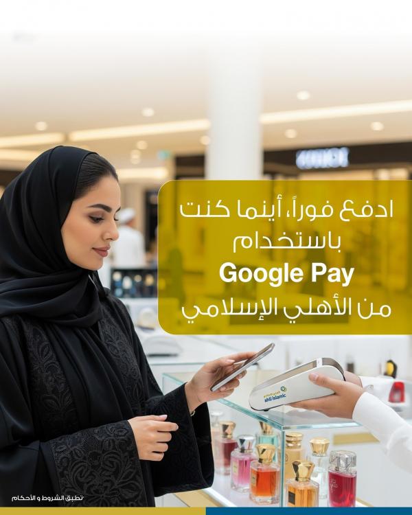 أطلق الأهلي الإسلامي خدمة "Google Pay" لحاملي بطاقات الخصم المباشر والبطاقات الائتمانية، إذ تأتي هذه الخطوة في سياق استراتيجية البنك الهادفة إلى توفير تجارب مصرفية أكثر سهولة وأمانًا، وتمكين العملاء من إجراء مدفوعات رقمية بدون تلامس في مختلف أنحاء العالم. ويجسّد هذا الإطلاق توجه الأهلي الإسلامي نحو الابتكار المستمر وتعزيز التحول الرقمي، بما يرسخ مكانته كمصرف إسلامي حديث يجمع بين مبادئ الشريعة الإسلامية والخدمات العصرية لتلبية تطلعات العملاء في العصر الرقمي.