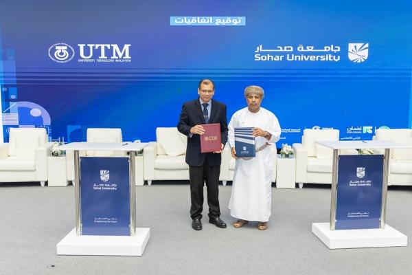 كما وقّعت الجامعة اتفاقية بحثية مع جامعة التكنولوجيا الماليزية (UTM) ضمن برنامج UTM–SU Matching Grant، بهدف تطوير مشروعات بحثية مشتركة ودعم التعاون العلمي بين المؤسستين، إذ تشمل الاتفاقية تنفيذ مشروع في الزراعة الذكية باستخدام تقنيات Digital Twin، وآخر في الاستدامة المالية والحوكمة (ESG)، بما يسهم في دعم الابتكار وتقديم حلول بحثية تخدم الأولويات الوطنية. وقّع الاتفاقية من جانب جامعة صحار الدكتور حمدان الفزاري، ومن جانب جامعة UTM البروفيسور رسلي بن محمد إلياس، نائب رئيس الجامعة للبحث والابتكار.