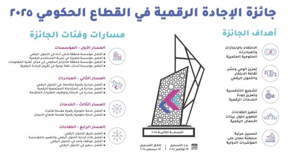 وتُعد الجائزة منصة رائدة لتكريم المؤسسات والمبادرات والخدمات والكفاءات المتميزة في التحول الرقمي؛ حيث تهدف الجائزة إلى الاحتفاء بالإنجازات ومكافأة المبادرات الحكومية المتميزة لإبراز النماذج المُلهمة في الابتكار الرقمي وتعزيز الكفاءة المؤسسية، كما تهدف الجائزة إلى تشجيع التنافسية ورفع جودة الخدمات الرقمية، فضلًا عن تحفيز العمل على تطوير حلول مبتكرة لبيئات الأعمال الرقمية وتحسين مرتبة سلطنة عمان في المؤشرات العالمية.