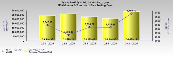 اختتمت تداولات بورصة مسقط، الأحد، على أداء إيجابي؛ إذ أغلق مؤشر MSX 30 عند مستوى 5,705.72 نقطة، محققًا ارتفاعًا قدره 69.73 نقطة، بما يُعادل 1.24% مقارنة بإغلاق الجلسة السابقة، في انعكاس واضح لتحسّن معنويات المستثمرين واتساع نطاق الشراء في السوق.