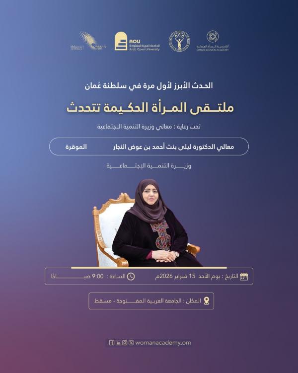 ويقام الملتقى تحت رعاية معالي الدكتورة ليلى بنت أحمد بن عوض النجار، وزيرة التنمية الاجتماعية، واستضافته الجامعة العربية المفتوحة بسلطنة عُمان خلال يومي 15 و16 فبراير 2026، بمشاركة نخبة رفيعة المستوى من القيادات النسائية، وصانعات القرار، وصاحبات الخبرات والتجارب المؤثرة في مختلف المجالات القيادية والتنموية.