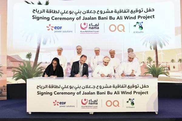 وقعت شركة نماء لشراء الطاقة والمياه، مساء الثلاثاء، اتفاقية شراء طاقة لمدة 20 عامًا مع تحالف دولي محلي يضم شركة "إي دي إف باور سوليوشنز"، و"شركاء الخضراء" و"أوكيو للطاقة البديلة"؛ بهدف تطوير محطة جعلان بني بو علي لإنتاج الكهرباء؛ باستخدام الرياح بقدرة 120 ميجاوات، ورعى حفل التوقيع معالي المهندس سالم بن ناصر العوفي وزير الطاقة والمعادن.