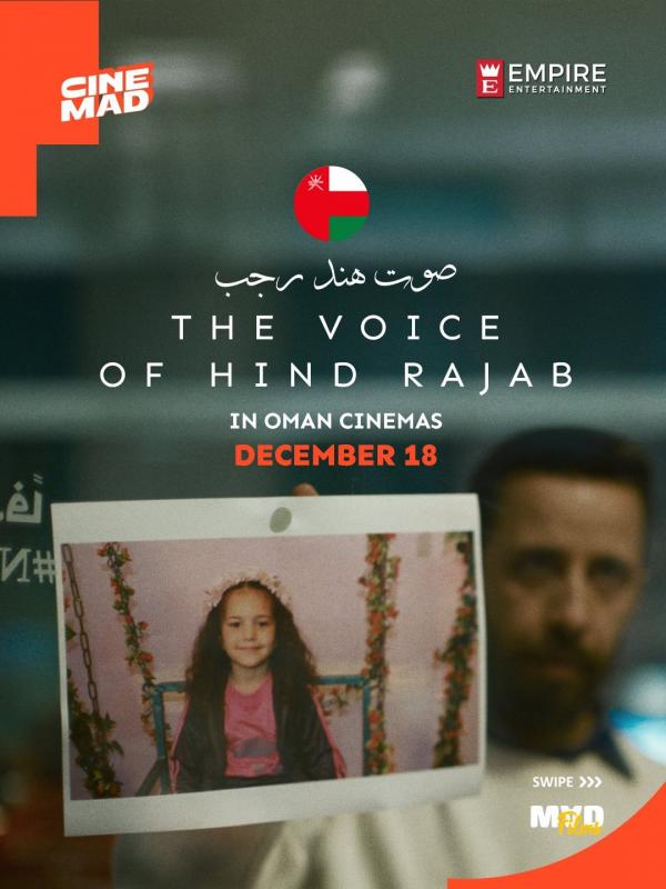 وسط إقبال لافت، تعرض 9 دور سينما في سلطنة عُمان الفيلم التونسي الفرنسي المشترك "صوت هند رجب"، المرشح لجوائز الأوسكار، تزامنًا مع حملة عرض واسعة في دور السينما العربية ضمن مبادرة سينما لعرض الأفلام العربية.